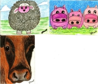 Today at Michael's, I found a little pig flashlight. It was such an unusual pig that I just had to have it to draw. So I sketched 3 of them for one of my cards. I also did another fat sheep;this one a black one. And a bull from a reference by LinDajSon on Wetcanvas. That's 7 finished and 2 more to go. This is the latest I have been doing and mailing my cards for a Drawspace trade. I usually have them ready before we get the name list and mail them shortly after.